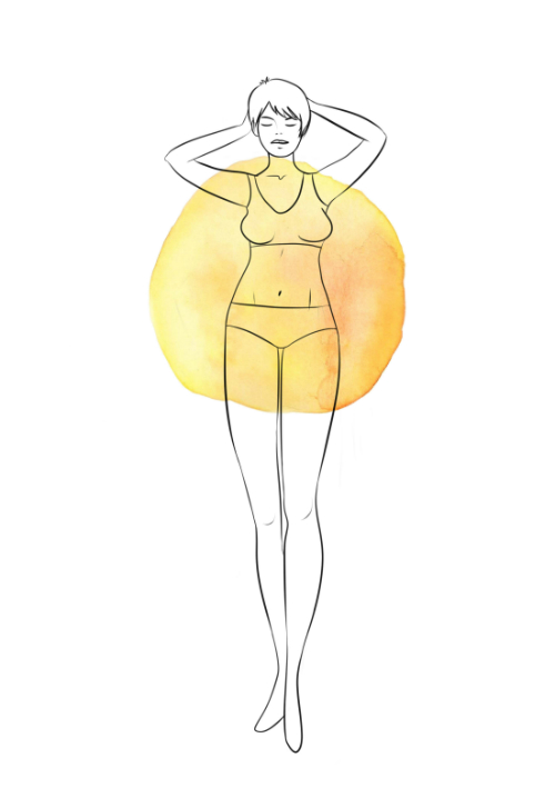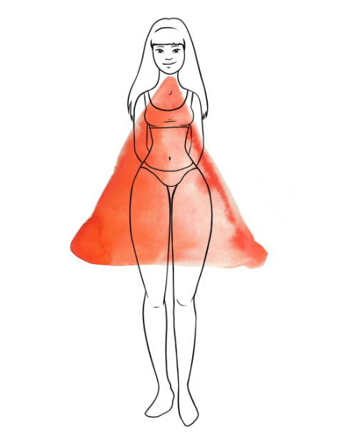 - Características: Sin cintura y con mucho volumen en la zona del abdomen. Suelen tener las piernas más delgadas, aunque a veces sólo se trata de un efecto óptico. Los hombros también son redondos.